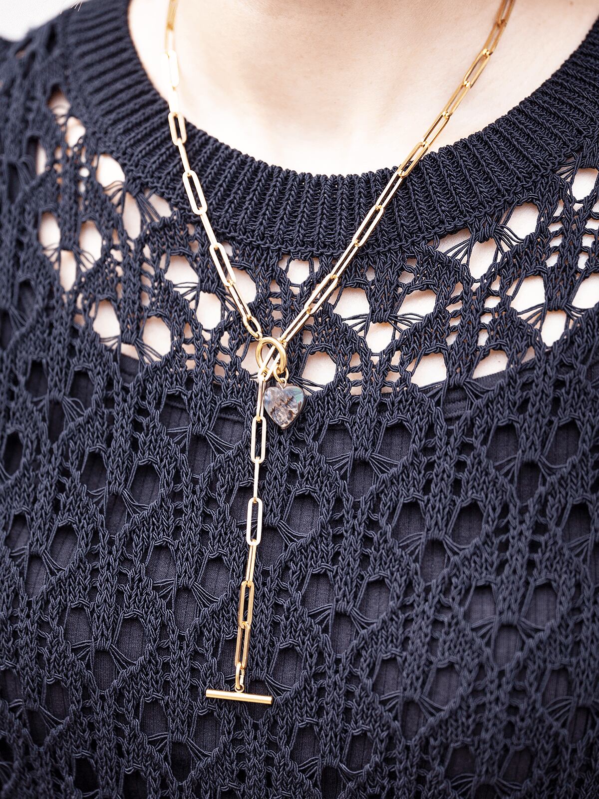 キラキラとツヤのあるステンレス製のチェーンネックレスに、アバロンシェルを合わせました。