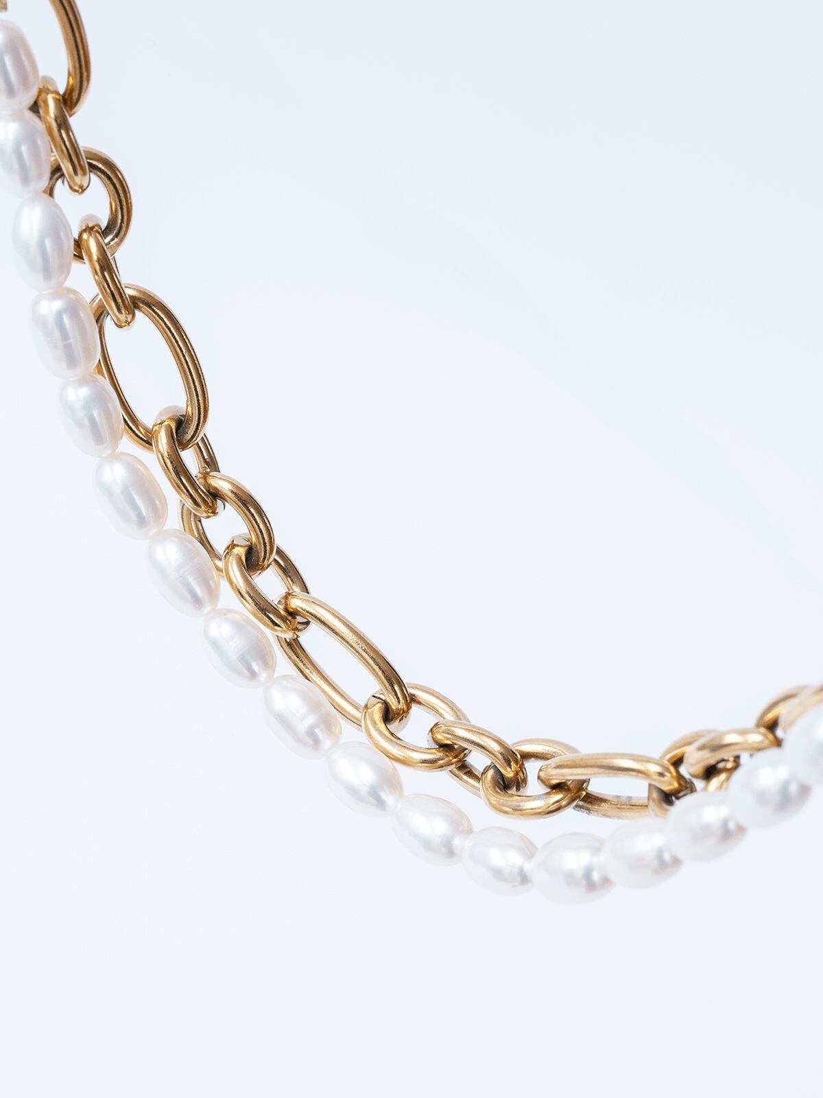 ボリュームのあるステンレス製のチェーンと、カラー・テリともにとても綺麗な淡水パールのブレスレットです。