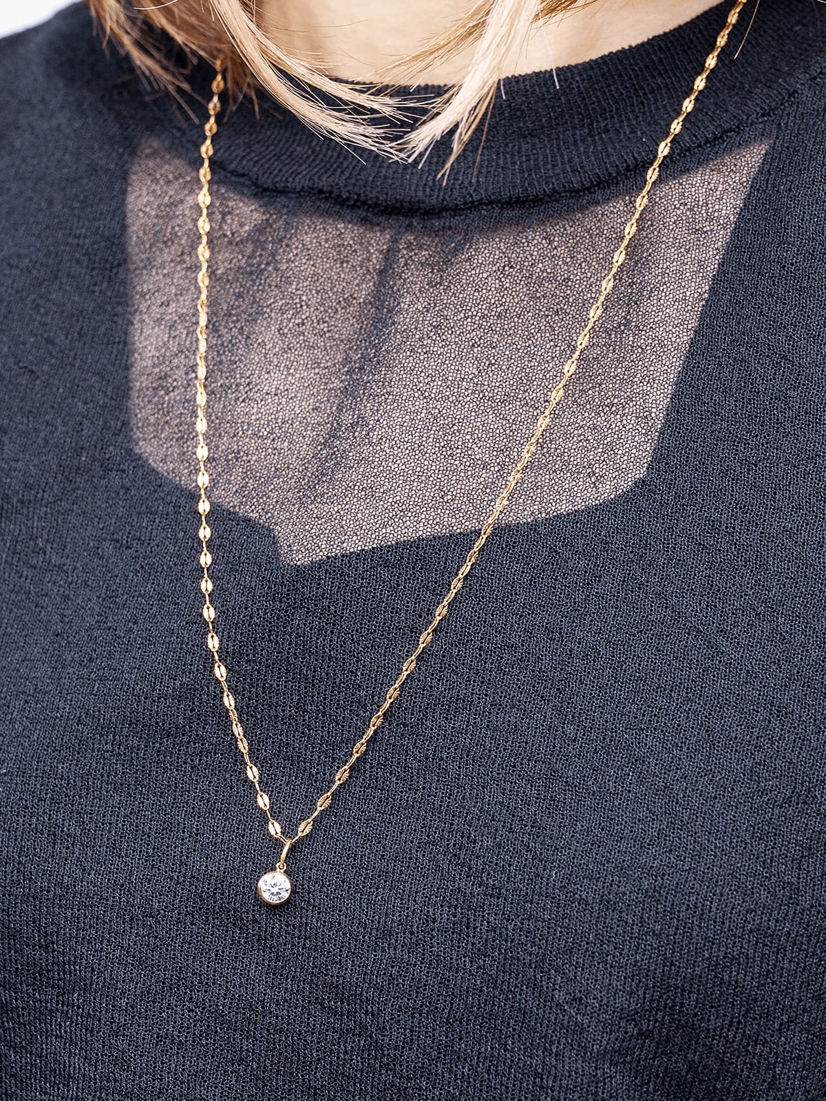 キュービックジルコニアのシンプルなネックレスです。 キュービックジルコニアのヘッド部分は14Kgh製となっています。 取り外し可能ですので、お手持ちのチェーンと交換可能です。 大きさ・素材 キュービックジルコニア約5mm、14Kgh製 チェーン約60cm、サージカルステンレス製